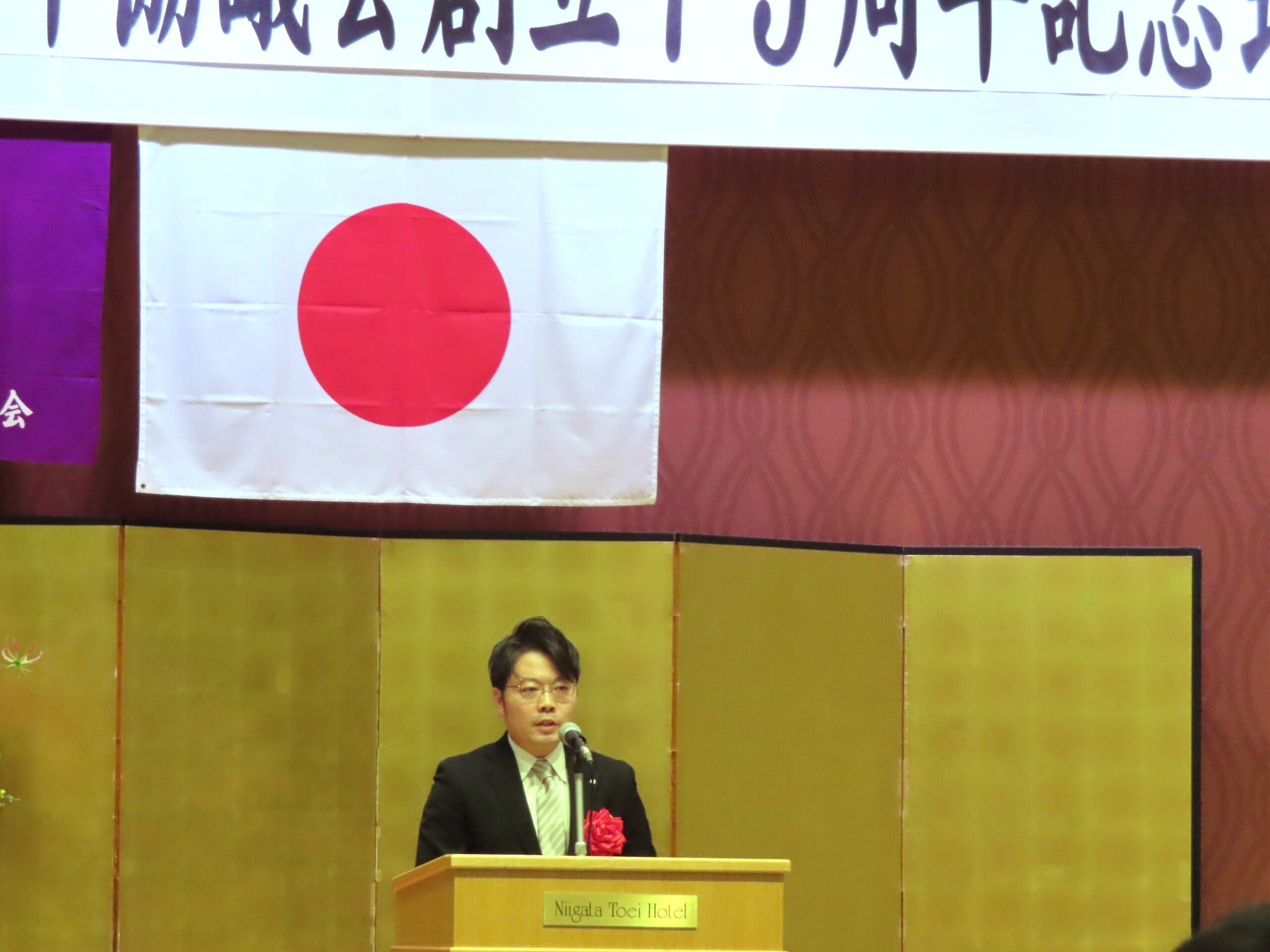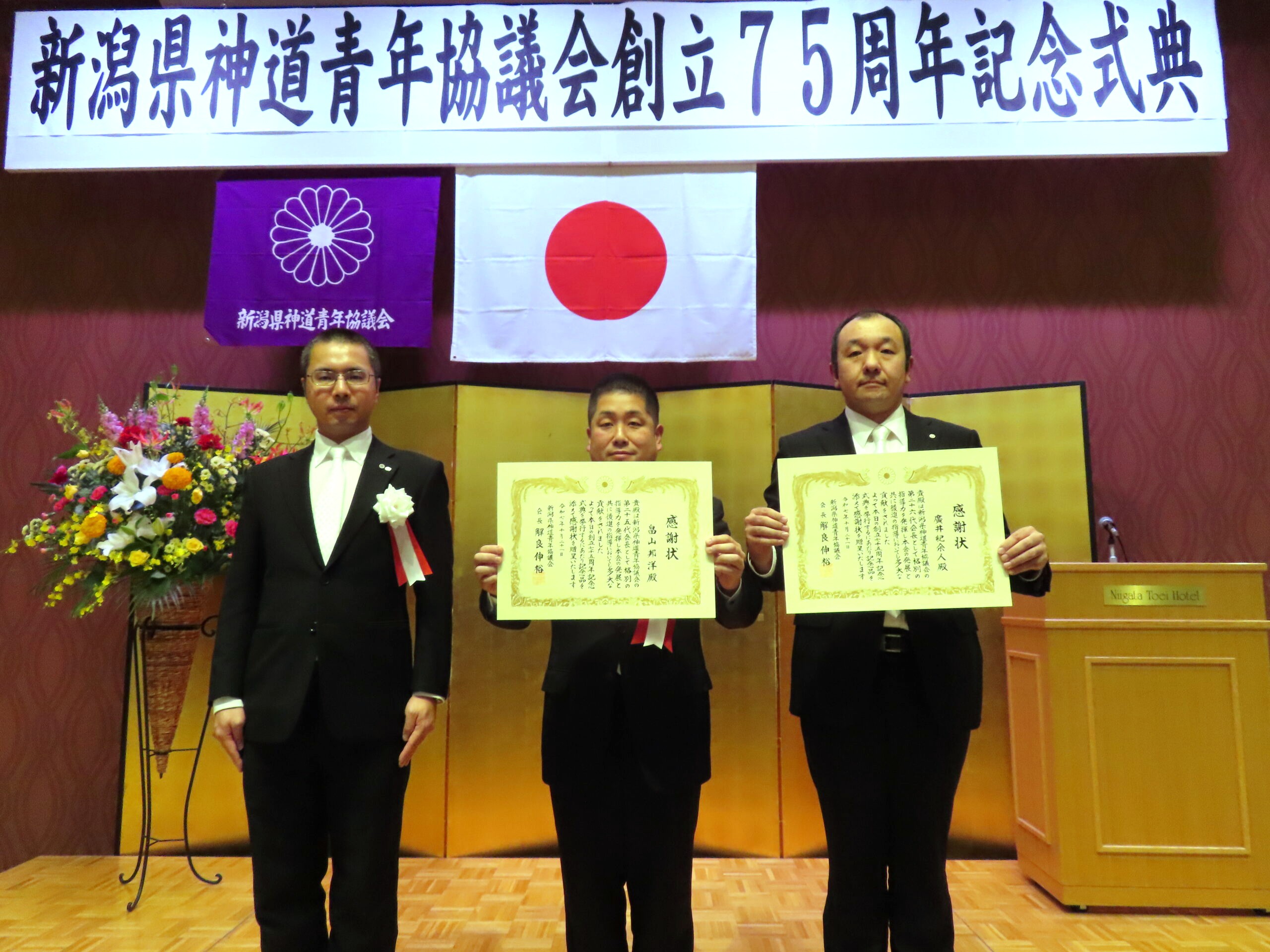 令和7年10月21日新潟東映ホテルにおいて、75周年記念式典並びに祝賀会を開催致しました。当日は新潟県神社庁長永井様、神道青年全国協議会会長北方様を始め、県内外より56名の来賓をお招きしての会となりました。